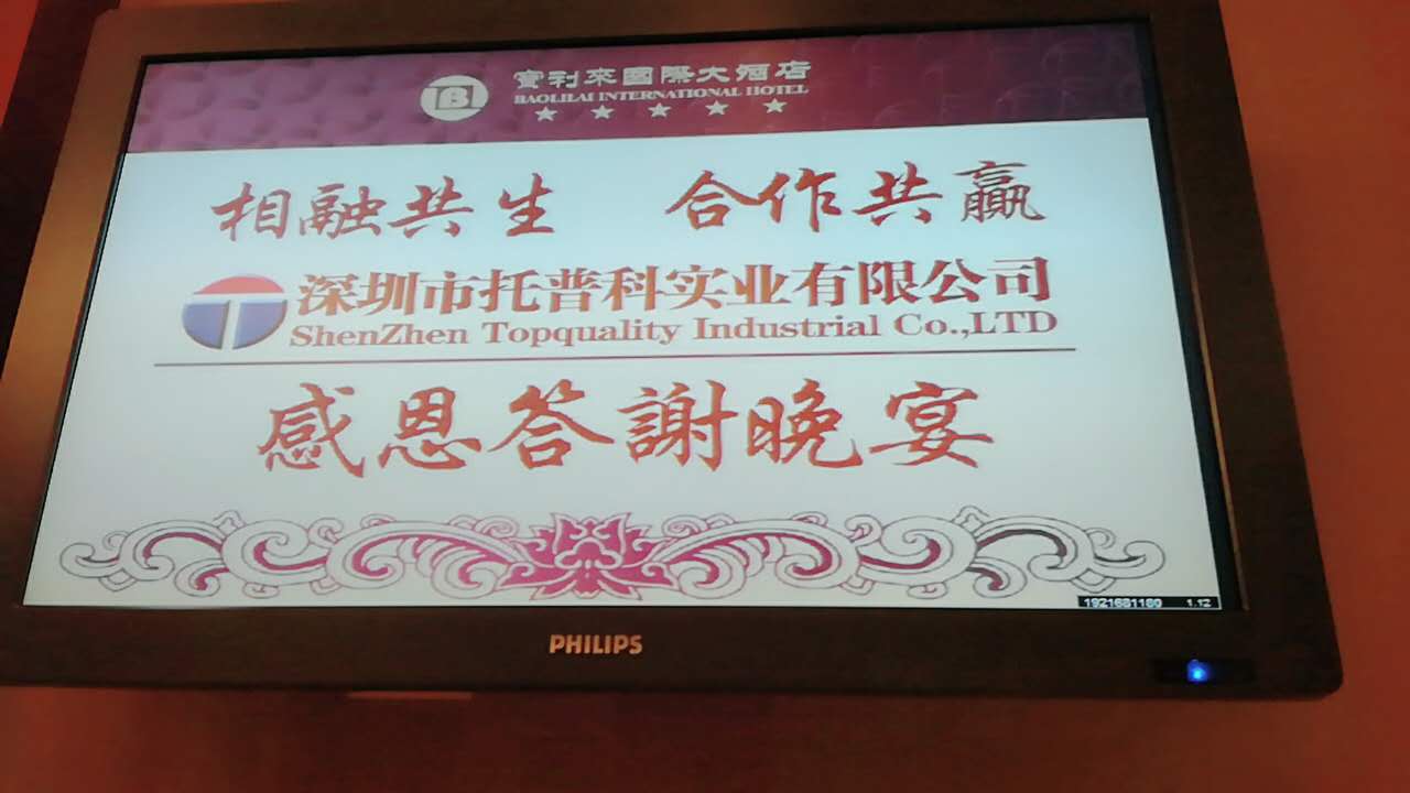 2017年6月2日,深圳市托普科實(shí)業(yè)有限公司感恩答謝晚宴在深圳福永寶利來國際大酒店拉開帷幕,“相融共生,合作共贏”是我們托普科這次感恩答謝晚宴的主題。答謝會除了表達(dá)對在場所有人員的感謝,更是打開大門,齊聚一堂,一起回顧了托普科十八年的歷程,感受品牌力量,分享品牌光芒,齊賞精彩節(jié)目表演,共襄盛舉。