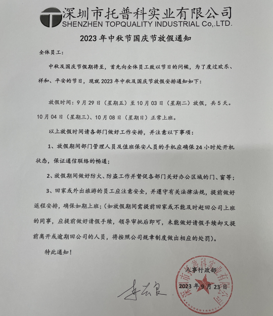 托普科實業(yè)2023年中秋國慶放假通知