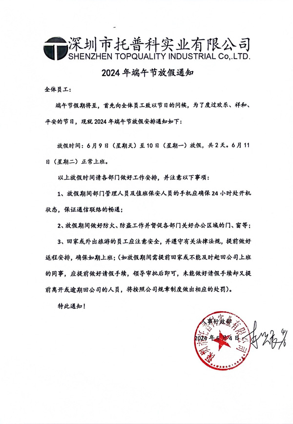 端午節假期將至,首先向全體員工致以節日的問候,為了度過歡樂、祥和、平安的節日,現就 2024年端午節放假安排通知如下:放假時間:6月9日(星期天)至10日(星期一)放假,共2天。6月11日(星期二)正常上班。