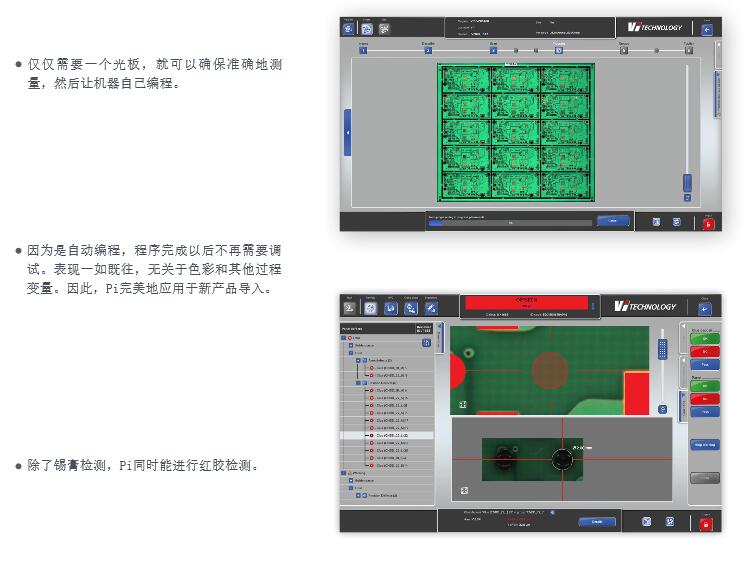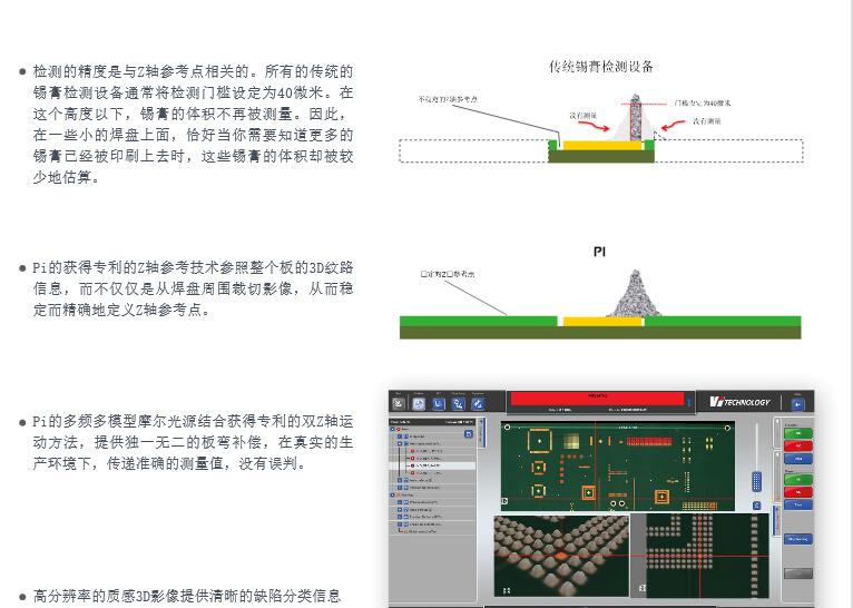 VI 3D錫膏檢測設備 PI Series 1. 自動編程可用于新產品的檢測 2. 除錫膏檢測外PIE也可進行固定膠檢測 3. 通過面積區域比率可實現自動分焊盤 4. 3D超大圖像檢查更便于使問題判斷 5. 通過SIGMA分析技術,離線SPC,嵌入式 SPC 實現實時程序監控